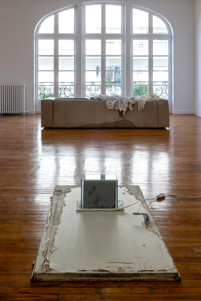 Plus loin, un monceau de tissus déchirés blancs, imbibés d’eau et de chlorure de calcium, dégorge d’un canapé hors d’âge. Edith Dekyndt a été marquée par le quartier des blanchisseurs à Bombay en Inde, où des milliers de personnes lavent le linge de milliers d’autres travailleurs. Ces tissus ici compactés nous rappellent également l’importance de la figure de style du drapé dans l’histoire de l’art. Recevant la lumière naturelle des fenêtres, la trace du corps humain subsiste.
