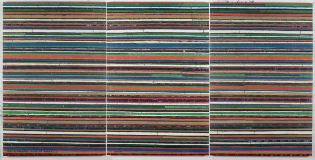 After the series of sculptures Queen Mary II, 2007, and the big series of Mappemondes, 2010 – 2014, the artist began in 2016 the Cocorico series of paintings, in progress to this day, made from the same recycled printed metal, with each part functioning as an unique work. Indeed, apart from the formal similarity that characterizes these works, each work has its own pictorial beauty and elegance.