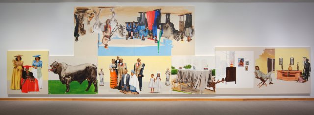 Democratic Intuition is an eight-part epic that includes multi-panel depictions of southern African life and folklore; its title is a nod to Gayatri Chakravorty Spivak’s theory that the functioning of democracy is dependent upon accessible education. Mokgosi engages this concept and its internal contradictions through compelling genre scenes—often involving prominent figures from public life—that jump-cut between the confines of manual work, the freedoms of intellectual enterprise, and their ties to gender and race. A parade of finely drawn characters emerges out of raw canvas backgrounds, portraying the asymmetries of power that underscore traditional divisions of labor.