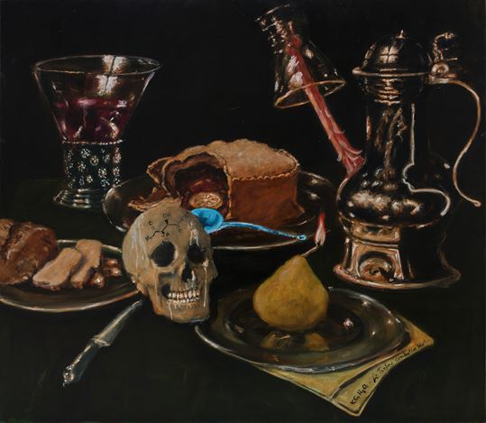 Dans Le bouillon de onze heures, Van Imschoot s’intéresse à la peinture de l’École du Nord du XVIIè siècle. L’artiste a choisi de puiser dans l’univers silencieux d’un des maîtres du genre : Willem Claeszoon Heda. Se situant dans la lignée des plus grands peintres flamands, Van Imschoot adapte la nature morte à son univers singulier pour lui rendre ses lettres de noblesse grâce à sa virtuosité et sa maîtrise du sujet.