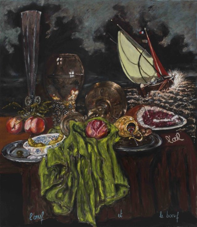 L’exposition propose ainsi des toiles au propos ambigu. On y voit une somptueuse cafetière couverte d’un verre de cristal accompagnée de lettres rouge-sang : «le viol ». Une ripaille d’antan se fond dans un paysage de mer agitée. Une coupe à vin se dresse, décalée, aux côtés d’un paquet de cigarettes. Le titre-même de l’exposition « Le bouillon de onze heures » est à double tranchant. Il désigne le dernier repas, tantôt empoisonné, tantôt réconfortant, d’un mourant.