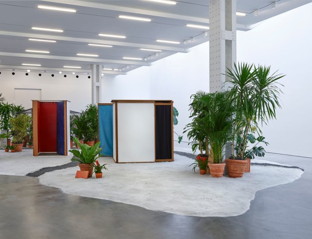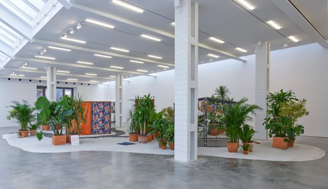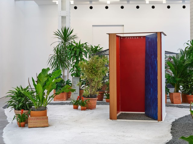 On view at 504 West 24th Street is Oiticica’s ground breaking, large-scale installation Tropicália (1966-67). Conceived in late 1966 and created in 1967, Tropicália was the first architecturally scaled installation that the artist realized, and the first in a series of works that would portray, and critique, his native country of Brazil. In this work, Oiticica addresses the clichés of the country’s association with a tropical paradise, including bright colors, sand, and exotic birds and flowers. It is composed of two Penetrables, small wooden shed-like structures referencing Brazil’s favela shantytowns, arranged to form a maze and intended to be entered and explored. PN2 (Purity is a Myth) is the smaller closet-like structure of the two, composed of wood panels, each painted a different color, with the phrase ‘Purity is a myth’ (‘a pureza é um mito’) printed in Portuguese on the inside. PN3 (Imagetical) incorporates fabric coverings and patterns in its larger construction, which weaves around until the visitor confronts the black and white television emitting continuous images and sounds from local stations. These structures are surrounded entirely by sand and gravel pathways which circle the island-like construction. Vibrantly colored macaws occupy another structure and objects scattered throughout — bricks, metal signs and cardboard — display handwritten poems by Roberta Salgado.