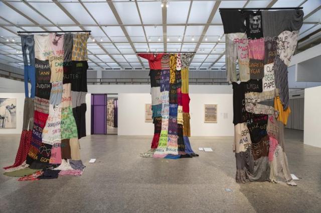 3- Installation view, Histórias feministas: artistas depois de 2000 (Feminist Histories: Artists after 2000), Museo de Arte São Paulo, São Paulo, Brazil, 2019. Work shown: Carolina Caycedo Mujeres en Mi, 2010–ongoing Organic fabrics, synthetic fabrics, and synthetic yarn 2-3 panels, each 12 × 6 ft. (3.66 × 1.83 m)