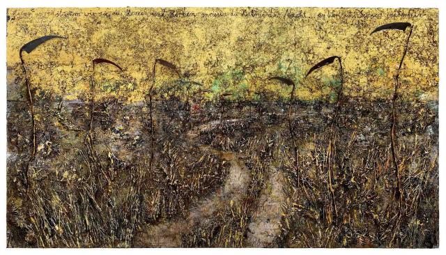Gagosian présente actuellement « Field of the Cloth of Gold », une exposition de quatre nouvelles peintures monumentales d’Anselm Kiefer.