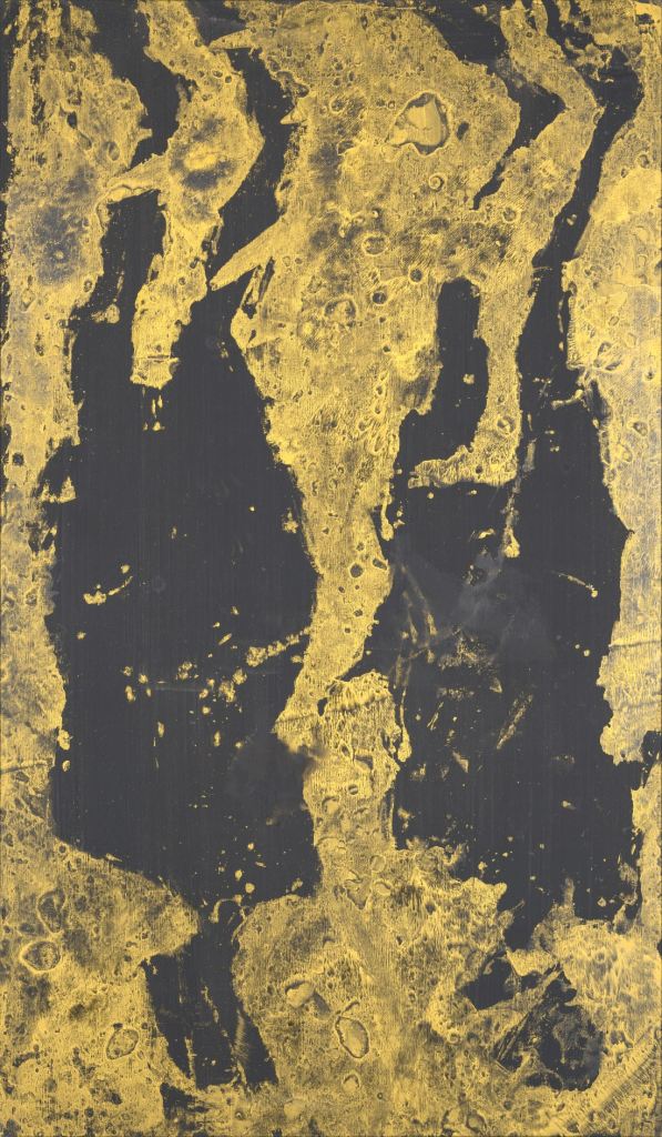 Baselitz défamiliarise et abstrait son sujet ; cependant, en raison de l’expressivité de la représentation, il ne perd rien de son effet narratif. Elke est présentée au spectateur dans une variété de colorations ; tantôt polychrome sur une surface blanche, tantôt jaune d’or sur une toile sombre. Dès les années 1960, au cours de ses visites à Paris, Baselitz a vu les œuvres de Jean Fautrier, Jean Dubuffet, Eugène Leroy et Wols et en a été fasciné. L’esthétique matérielle de ces artistes a continué à influencer la pratique de Baselitz depuis lors, ce qui est particulièrement évident dans cette nouvelle série d’œuvres.
