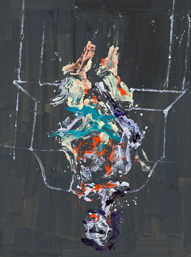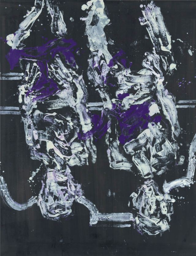 While in Bacon’s work hidden internal states are revealed by deformations, Baselitz intensifies the intimacy and sensuousness of his motif in the heightened abstraction he achieves through his technique. The works were created through the transfer of colour, thereby evoking associations with Andy Warhol’s series of Rorschach paintings and Blotted Line Drawings, as well as with Roy Lichtenstein’s frozen Brushstrokes. He introduces an element of chance into his compositions and offers a reflection on the meaning of painting itself.
