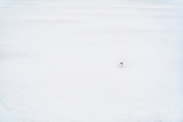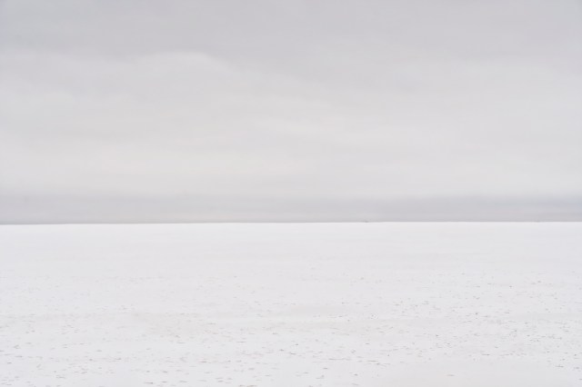 tracent des signes dans un paysage immaculé tels de subtils coups de crayon sur une feuille (Emergence), tandis que des pneus viennent corrompre un relief qu’ils épousent, se dispersant comme des notes sur la portée d’une partition (Invaders). Des vues enneigées inspirées du film d’Eisenstein, Alexandre Nevski, que composent des horizons, évoquent des peintures minimales abstraites.