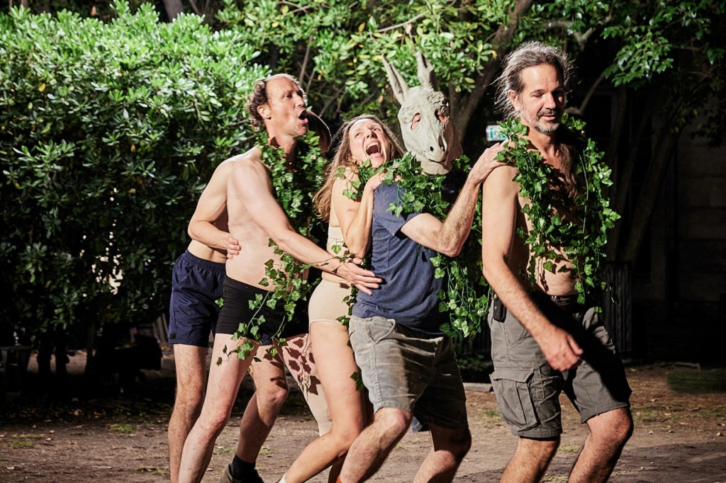 « Mourir, dormir, rêver peut-être » écrit Shakespeare des années après Le songe d’une nuit d’été, poursuivant ainsi une réflexion entamée sur la pluralité des dimensions et l’altération des états de conscience. Le jeu sur les frontières entre réel et fantastique est au centre de cette pièce, et la mise en scène excellente (cette année dans le OFF) de la compagnie Point-Zéro exploite au maximum cette brèche. Chez Morin (dans le IN donc) au contraire, nul désir de déployer une myriade d’effets technologiques et scéniques pour signifier le passage du royaume des hommes aux royaumes des fées : un collier de lianes, une simple toge blanche, cela suffit. Le plateau sans tréteaux est posé à même la poussière : étendu sur une large cour, de vrais arbres constituent la forêt, aux pieds desquelles les cailloux font mal au dos quand on s’y couche. C’est avec une grande simplicité que les quatre acteur-ices (et deux figurants) incarnent une myriade de personnages différents, des comédien-nes débraillé-es à la reine Titania en passant par les quatre amoureux écervelés qui décident de se perdre en forêt pour mieux se retrouver.
