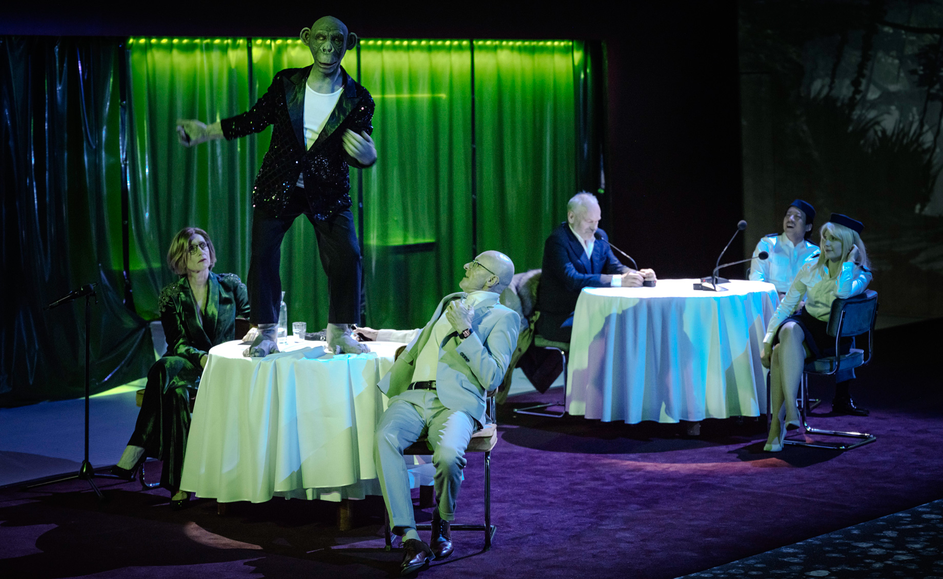 La première et principale partie du spectacle fait revivre, entre autres, des conférences données par Elizabeth Costello, romancière célèbre sur le retour, dans de grandes universités sur des sujets aussi curieux et variés que la sexualité entre les hommes et les dieux, les abattages d’animaux de boucherie – qu’elle assimile avec aplomb à l’Holocauste – et autant d’autres sujets prétextes à ses divagations. Sans doute à la recherche d’elle-même – « J’ai des opinions mais je n’y crois pas » – elle bouscule son auditoire par des propos souvent extravagants et livre sur un ton monocorde une parole libre, dense et décousue dont les spectateurs cherchent vainement à retrouver le fil.