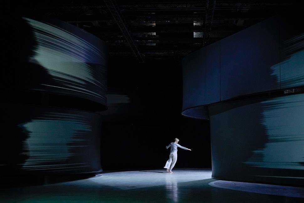 Dans « Deadlock », le dispositif est voulu comme une expérience pour le spectateur car, avant que ne commence vraiment le spectacle, les gens peuvent déambuler dans l’espace puis revenir s’asseoir dans des sièges noirs placés de façon inhabituels, en suivant la courbe des écrans, comme une réponse à ce blanc immaculé qui nous entoure. Cristina Caprioli nous plonge ainsi dans la danse, magistralement interprétée par Louise Dahl, puissante et inlassable dans ces tours et ces jeux de bras, dans cet espace en forme d’ogive où sont placés astucieusement des écrans non pas bêtement de face ou simplement sur un des côtés, mais en ellipse, découpés tout autour de nous et sur lesquels la danse est d’abord projetée avant que n’entre la danseuse pour habiter littéralement seule le plateau. Les parties du corps sont projetées et les images, de fait à cause – ou grâce – à ce dispositif, sont coupées. Le bras sur la partie basse de l’écran, la main juste au-dessus mais sur un autre écran. Les corps semblent distendus, infinis. Les images se rependent dans l’espace de la face au lointain. La musique de Richard Chartier, omniprésente, sorte de prise de son dans le cosmos, passe d’un grondement à un souffle pour laisser place à un bruit strident, assourdissant. La danseuse surgit cheveux courts, costume blanc et s’engage dans un mouvement des bras. Le buste est très fluide. Elle semble se pencher comme pour saluer et repars dans une échappée. A l’écran, les gros plans sur les parties du corps accompagnent la danse. Les lumières crues, presque cliniques font ressortir les détails mais aussi placent la soixante de spectateurs présents dans un état d’attention extrême. Cette chorégraphie très expérimentale, pas loin de la danse Soufi avec ces tours et ces mouvements du buste, s’accorde bien avec l’esprit de la Biennale d’Art contemporain qui se déroule tout autour.