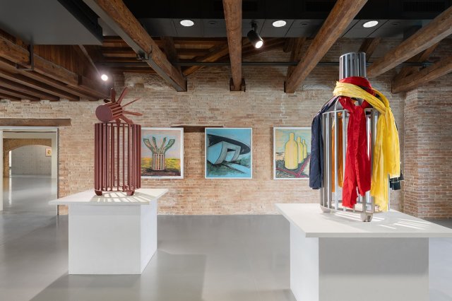 Images: 1 – Thomas Schütte, Modell und Ansichten, 1982, collection of the artist © Thomas Schütte, by SIAE 2025. Installation view, “Thomas Schütte. Genealogies”, 2025, Punta della Dogana, Venezia. Ph. Marco Cappelletti © Palazzo Grassi – Pinault Collection / 2 – Thomas Schütte, Mann im Wind II, 2018, Pinault Collection; Mann im Wind I, 2018, Pinault Collection; Mann im Wind III, 2018, Pinault Collection; DEKA Fahnen, 1989, Courtesy the artist and Peter Freeman, Inc., New York/Paris © Thomas Schütte, by SIAE 2025. Installation view, “Thomas Schütte. Genealogies”, 2025, Punta della Dogana, Venezia. Ph. Marco Cappelletti © Palazzo Grassi – Pinault Collection