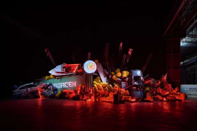 “ICARUS” is the title of Yukinori Yanagi’s exhibition, curated by Vicente Todolí and Fiammetta Griccioli, which brings together a series of site-specific, immersive works that chronicle the artist’s career in the Navate and Cubo spaces of Pirelli HangarBicocca. The title evokes the Greek myth of Icarus and Daedalus which serves as a cautionary message as well as an invitation to reflect upon human arrogance born from overconfidence in technology. By getting too close to the sun (which the artist understands as a metaphor for nuclear energy), Icarus becomes responsible for his own downfall. The exhibition narrative presents visitors with a constant duality, establishing a dialogue between past and present, destruction and rebirth, reality and fantasy, matter and symbolism, movement and permanence. The idea of transcending physical boundaries, represented by elements such as containers, barrels and other objects used in transportation systems, becomes a metaphor for global interconnectedness.