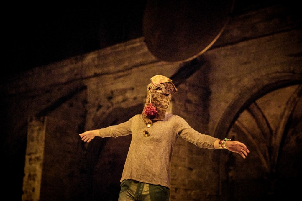 Tapis blanc au sol, une sphère-écran et rien d’autre. Des personnages masqués avec des symboles animaliers qui surgissent. Des récits en toutes les langues qui défilent. Des entrées lentes en contre-jour, des masques d’animaux, des figures étranges dotées de chapeaux ronds, d’instruments de musique, un bestiaire imaginaire, une sorte de codex qui rappelle des êtres connus…