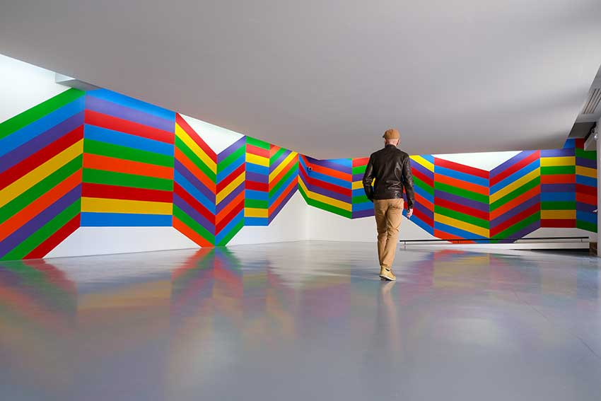 C’est aussi le moment de revoir des pièces de Richard Tuttle, Robert Mangold et ces trois pièces V, X, W posées au mur. On n’échappe pas aux œuvres de Sol LeWitt, présent dans le musée avec une salle entièrement peinte par lui. C’est la grande force de ces deux expositions, car là où des artistes par leur radicalité pourraient nous heurter, les commissaires ont placé des œuvres d’Othoniel qui nous donnent la possibilité de sortir de ce tunnel en admirant ces pains de verres, oranges ou verts, qui permettent des échappées dans ce musée aux murs blancs et clos.