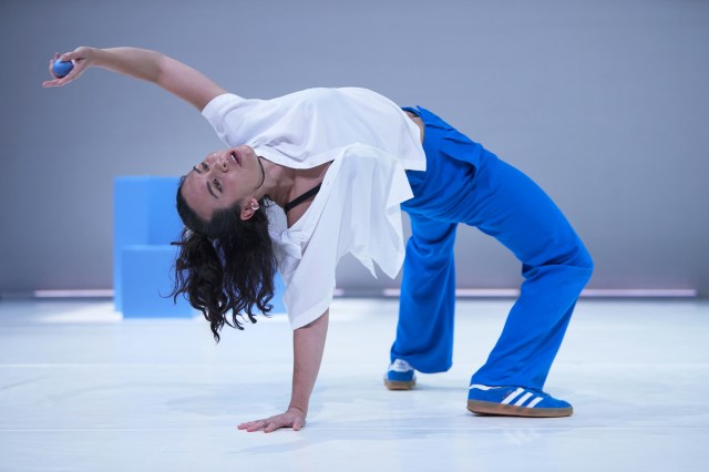 Encore un cyclo blanc. Des néons au sol à la face et au lointain. Des cubes bleu pétrole, trois à cour, un à la face et à jardin un triangle recouvert d’un miroir. Le point de départ est abstrait, et pour cause, puisque la danseuse, chemisier blanc, pantalon bleu, tennis blanches, commence son récit par le big bang, Adam et Eve, à tout ce qu’il y avait et ce qu’il n’y avait pas. Et c’est vrai que, tant qu’à commencer, autant le faire par le début !
