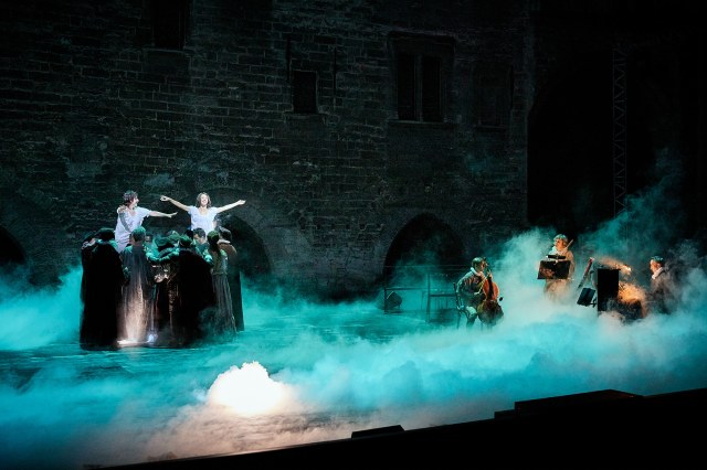 Ce sont les acteurs avant tout qui sont mis en avant, au travers de magnifiques tableaux et d’éclairages recherchés. Des acteurs qui investissent toute la Cour d’Honneur, qui se mêlent au public, qui bondissent sur scène, dévalent des gradins, apparaissent aux fenêtres du Palais. Des acteurs qui prennent le texte de Claudel à bras-le-corps, qui nous livrent avec passion ce magnifique texte poétique avec une diction précise, appuyée.