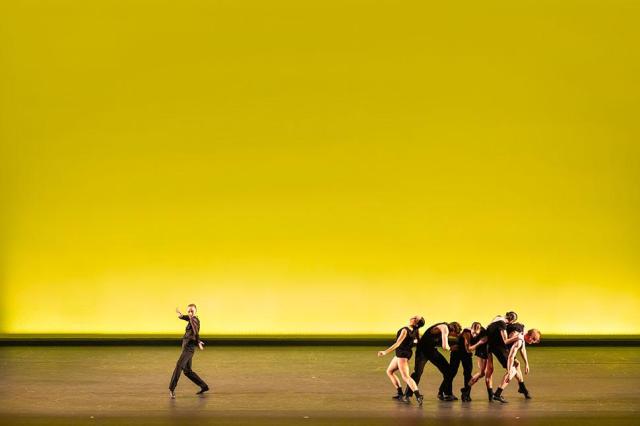 On le sait, Wayne Mc Gregor aime les artistes français et il ne manque d’ailleurs pas d’en inviter… C’est le cas avec OTAN, une création de 2024 du circassien, ancien directeur du Centre chorégraphique national de Grenoble, Yoann Bourgeois associé pour l’occasion avec le chanteur québécois Patrick Watson. Initiée pendant la pandémie, cette pièce ne brille pas par son économie de moyens puisque ce ne sont pas moins de quatre plateaux dont une tournette à la face qui sont nécessaires à ce spectacle… Bien sûr, au centre de cette tour de Babel, faite d’escaliers à la Escher, un espace pour le musicien qui a tout son attirail pour chanter – instruments, micros… de chaque côté, deux plateformes, l’une à jardin qui permet de placer le trampoline, agrès fétiche du circassien, en contrebas et à cour un autre espace qui permet des descentes comme dans un skate parc, avec arrivée boomerang sur des tapis roulants permettant quelques figures particulièrement téléphonées poussant les interprètes vers cette tournette carrée qui semble si lourde à faire tourner, justement…