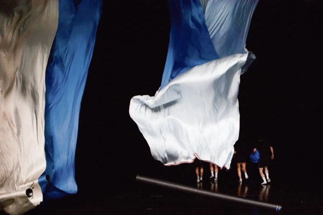 La vague bleue façon ressac de la mer est une des plus belles images du spectacle et il n’y a pas que les ventilateurs géants pour faire bruisser le tissu. Les perches manipulées par les danseurs provoquent aussi de belles images… Bref, une pièce qui se laisse regarder mais sans soulever les passions.