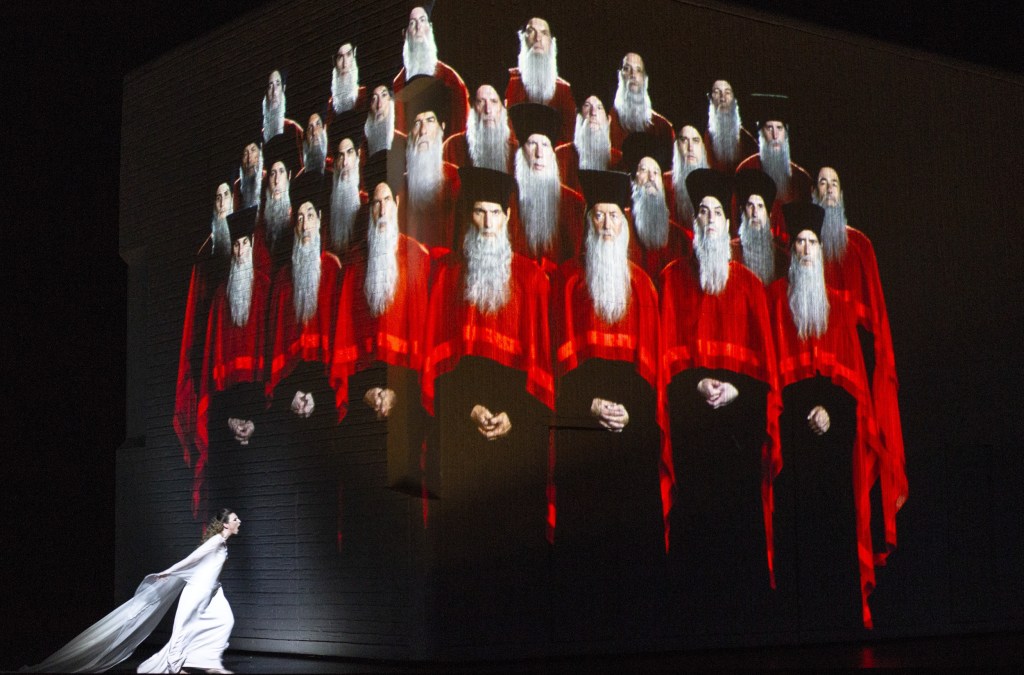 L’artiste iranienne propose une version imposante et en même temps intime du drame de Verdi : En effet, occupant la majeure partie de la scène un immense cube gris qui tourne sur lui-même, il peut s’ouvrir en deux pour devenir un temple ou une tombe, les chanteurs sont le plus souvent devant ce cube et donc à proximité du quatrième mur. La surface du cube sert d’écran pour des projections qui sont pas toujours pertinentes mais la proximité avec les spectateurs provoque une forte impression surtout lors des scènes où on détaille des corps et des visages comme la scène de bataille du second acte. L’effet serait très amoindri si la vidéaste iranienne avait choisi ces mêmes projections en fond de scène. Les lumières, pleine d’ombres, de Felice Ross et les costumes, sombres pour la plupart, ajoutent à cette ambiance un côté fantomatique à l’intensité dramatique parfaitement aboutie.