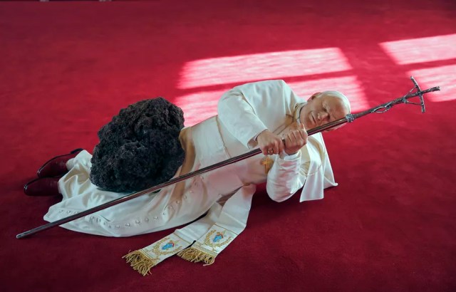 Images : 1 & 2, Saint or sinner, copyright Mason Storm 2025 – 3 – *Maurizio Cattelan, Pope Struck by a meteorite – copyright the artist