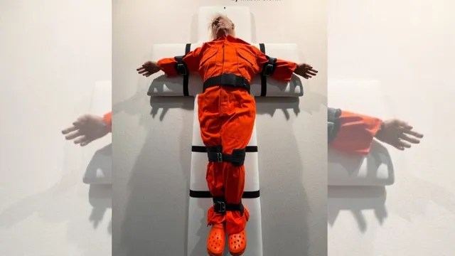 L’artiste anglais expose depuis le 3 novembre dernier à Bâle cette sculpture représentant Donald Trump crucifié, en combinaison orange de Guantanamo, attaché à une croix par des sangles de contention. Une sculpture provocatrice de Mason Storm qui n’est pas sans évoquer le Pape écrabouillé de Maurizio Cattelan*…