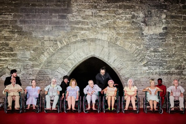 Mais jetons quelques balises de ce que peut être ce « spectacle » (mais qui n’en est pas un vraiment, plutôt une catharsis), terrifiant d’acuité artistique et de liberté. Imaginez un plateau nu, à l’exception de quelques accessoires liddelliens éparpillés le long du grand mur des Papes, accessoires sortis tout droit de l’univers médical et mortuaire : fauteuils roulants, cuvette à lavements, chiotte, pissotière duchampienne de porcelaine blanche, clinique. Et c’est tout .