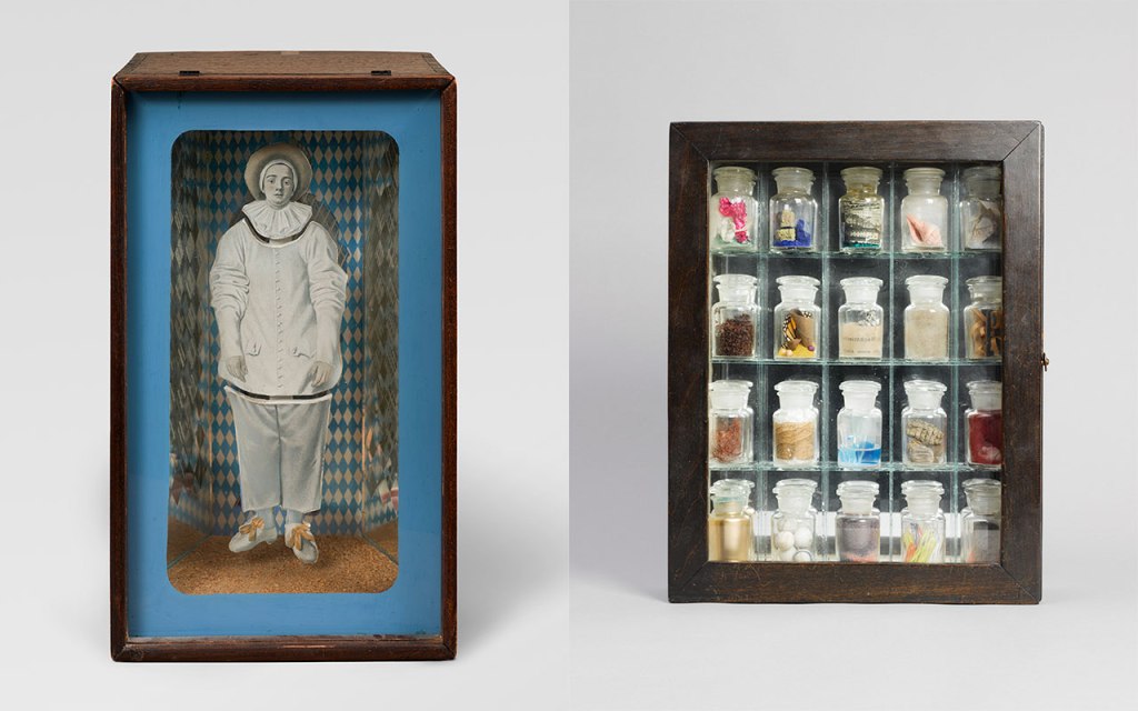 Richard L. Feigen Collection – © 2025 The Joseph and Robert Cornell Memorial Foundation/Licensed by VAGA at Artists Rights Society (ARS), New York – Photo: Owen Conway – Courtesy Gagosian / Joseph Cornell Pharmacy, 1943 – Glass-paned wood cabinet, marbled paper, mirror, glass shelves, and twenty glass bottles containing various paper cuttings (crêpe, tissue, printed engravings, and maps), colored sand, pigment, colored aluminum foil, feathers, paper butterfly wing, dried leaf, glass marble, fibers, driftwood, wood marbles, glass rods, beads, seashells, crystals, stone, wood shavings, sawdust, sulfate, copper, wire, fruit pits, paint, water, and cork 15 1/4 x 12 x 3 1/8 inches (38.7 x 30.5 x 7.9 cm) © 2025 The Joseph and Robert Cornell Memorial Foundation/Licensed by VAGA at Artists Rights Society (ARS), New York – Photo: Dominique Uldry – Courtesy Gagosian