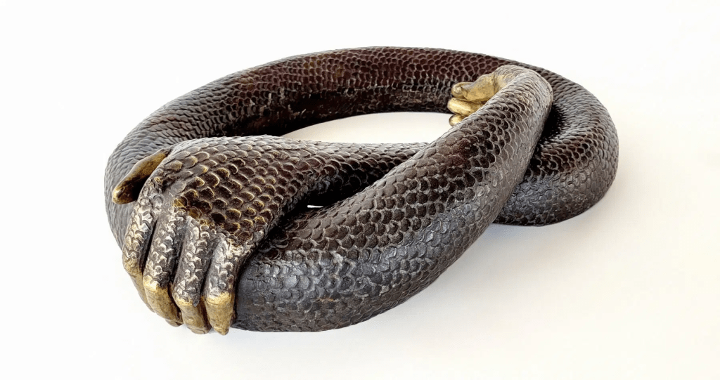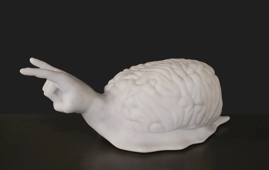 Parmi les œuvres exposées citons Papillon (2021), Caracol – Le rythme de l’évolution (2021), Chou (2023), White Coral (2025), Serpent (2021)… D’autres sculptures sont inspirées de l’univers minéral comme Quartz (2023), ou organique ou végétal comme Pies Tronco (2021), un tronc d’arbre avec des pieds, The Cloud – Bell (2024). Concrete Coral (2025) mixe le matériau industriel et la forme organique,ou encore Maison Fond (2022), sculptée en marbre de Carrare, une architecture qui « fond », en perpétuelle transformation… Pulled by the Roots (2015) parle de déracinement, tandis que Carte (2026), est une oeuvre cartographique d’acie… L’exposition comporte également série de photographies qui évoquent des hybridations entre l’espace, la perception du réel…