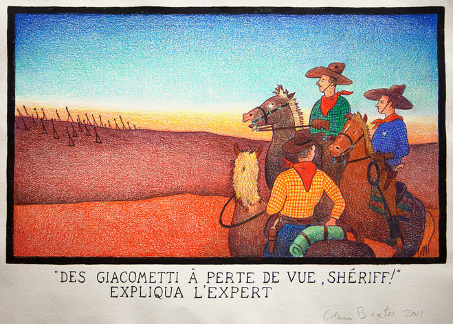 Trublion de l’Art contemporain, il mettait en scène de drôles de cow-boys malicieux, des scaphandriers jouant du ukulélé en eaux profondes, des aérostiers délirants et toute une galerie de personnages perchés comme leur auteur lui-même d’ailleurs. Pratiquant avec génie le non-sens et l’absurde, en droit héritier de Dada et des situationnistes, le dessinateur était le digne représentant de l’humour anglais, poussé à l’extrême, avec un goût prononcé pour l’art décalé des Monty Python ou d’un Mister Bean et de belles affinités avec le théâtre d’un Ionesco, d’un Beckett ou d’un Jarry. Cet humour lunaire qui caractérisait ses productions se repérait au premier coup d’oeil, comme leurs légendes totalement déjantées révélaient la pâte singulière de l’artiste.