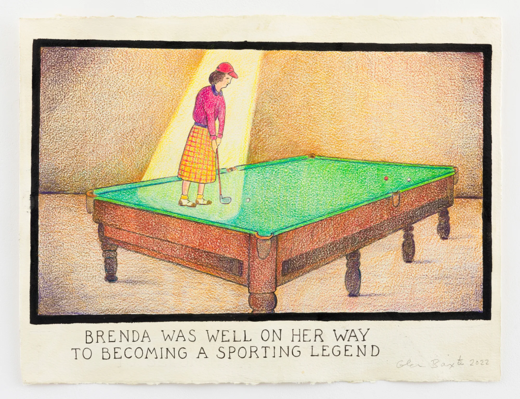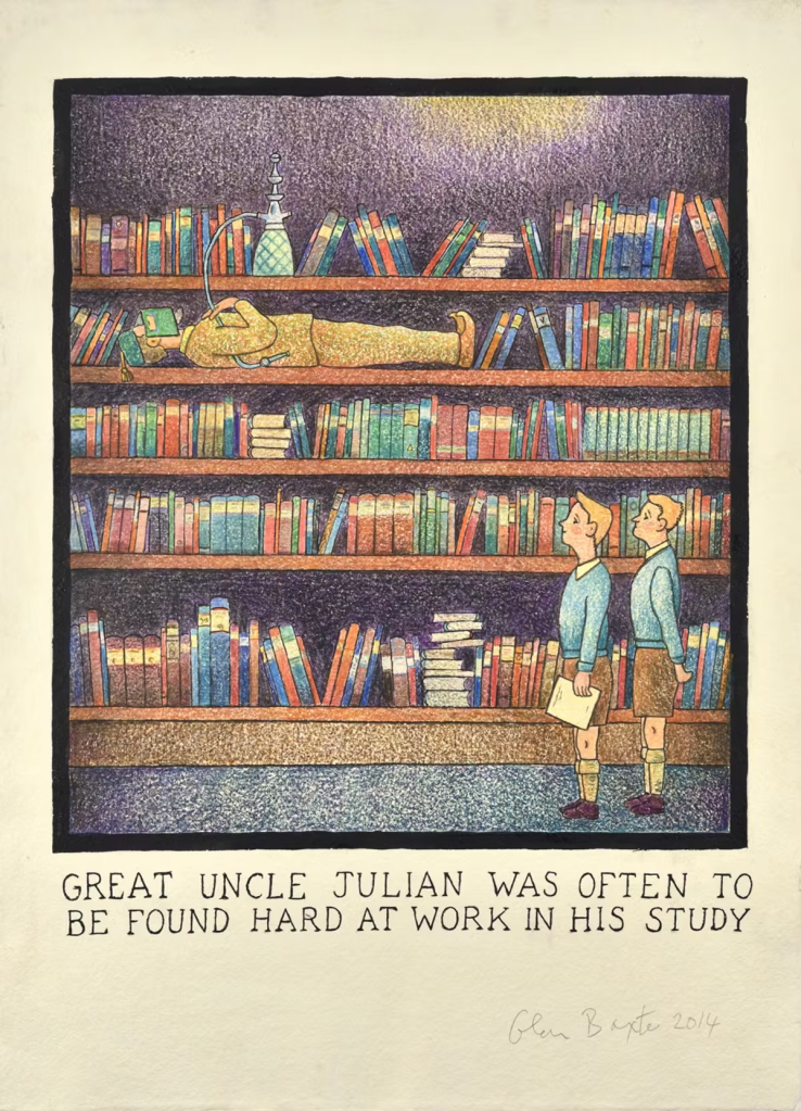 Célèbre pour ses dessins loufoques, adepte du non-sens et digne héritier des dadaïstes et des surréalistes (de Chirico, Picabia, Magritte, Beckett, Roussel…) Glen Baxter a développé une appétence certaine pour l’incongru et l’ironie british. Ses dessins, il les agrémentait de commentaires pour obtenir des effets de décalage, une incongruité commune du texte et de l’image, nouant un rapport intense avec la langue et ses sonorités. Au burlesque de la situation dépeinte répond le grotesque d’un commentaire énoncé le plus sérieusement du monde.