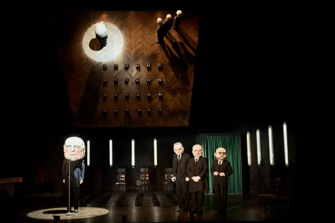 Un immense miroir mobile domine le plateau, véritable pivot dramaturgique qui modifie constamment les perspectives. Cet objet scénique ne se contente pas de refléter: il écrase les silhouettes. L’image des vingt-quatre paires de chaussures vernies, parfaitement alignées, symbolisant les industriels allemands prêts à marcher au pas du régime nazi, demeure gravée dans les mémoires par sa sobriété redoutable.